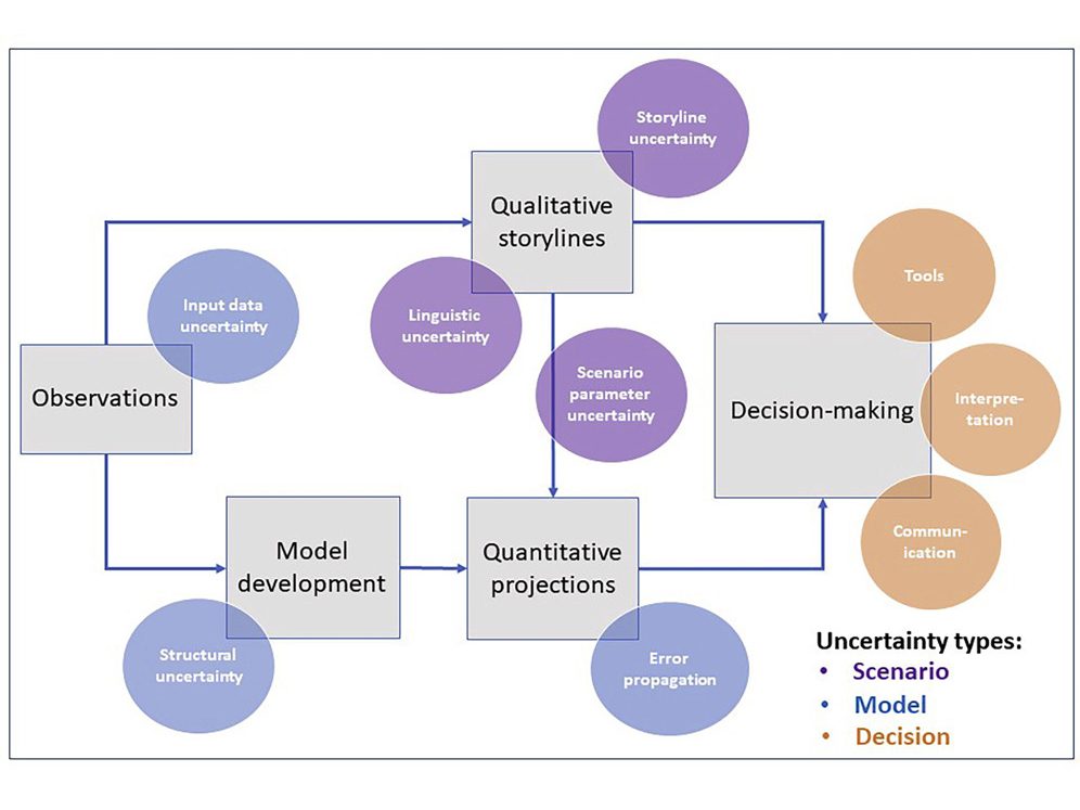 – Narratives storyline uncertainty. The limits to imagining unknown futures (e.g., unknown unknowns). This can relate, for example, to alternative worldviews or the uncertainties associated with participatory processes arising from internal consistency and knowledge limitations.