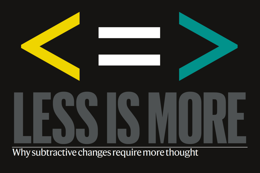 Subtraction is the act of getting to less, but it is not the same as doing less. In fact, getting to less often means doing, or at least thinking, more.