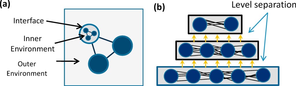 the rate of interaction between the component and other components on its own level of organization (Outer Environment). The Inner and Outer Environments are separated by the component Interface, which can be seen as the emergent (designed or evolved) totality of the component: its interaction modalities and pathways of interaction.