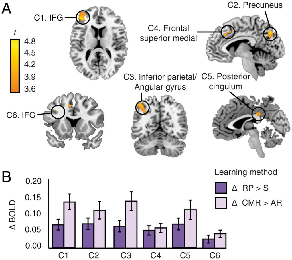 (B) The bar graph shows the difference (Δ) in blood-oxygen-level–dependent (BOLD) activity when contrasting active > passive learning for each brain region (C1–C6) and course subject (dark purple bars = Δ RP-S; light purple bars = Δ CMR-AR).