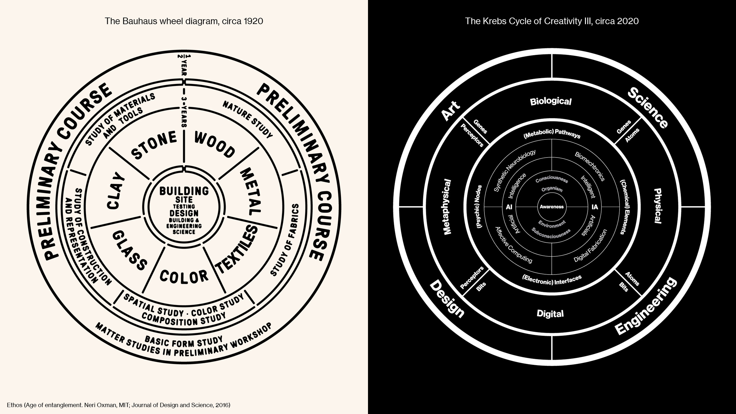 Oxman uses wheel diagrams to outline modes of creativity (1920 – Bauhuas & 2020 – KCC)