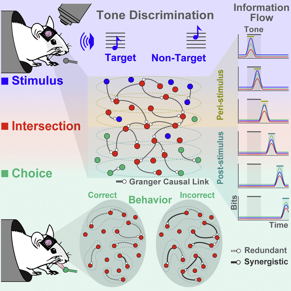 These neurons form functional networks in which information transmits sequentially. Network structures differ for target versus non-target tones, encode behavioral choice, and differ between correct versus incorrect behavioral choices. Correct behavioral choices are associated with shorter communication timescales, larger functional correlations, and greater information redundancy.