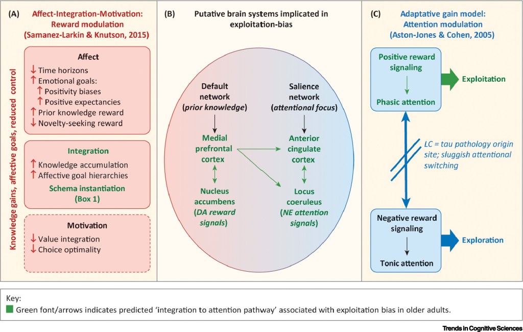 There is – according to the review – emerging evidence that the shifting architecture of cognition, affect, and brain function leads to the emergence of an exploitation-biased mental mode in later life; one that favors the exploitation of prior knowledge over exploratory search for novel information, solutions, associations, and experiences. This shift in the exploration and exploitation trade-off reflects reduced cognitive control in the context of growing stores (and influence) of prior knowledge, as well as a shift toward affective goals, and parallels age-related changes to cortical brain networks, attention, and reward circuits.