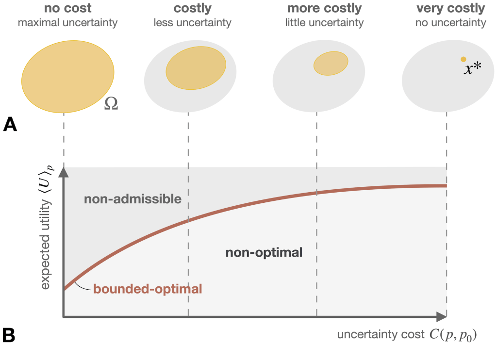 Fig.B: Voorbeeldige efficiëntiecurve als gevolg van de afweging tussen nut en kosten, die niet-optimaal van niet-toelaatbaar gedrag scheidt. De punten op de curve komen overeen met begrensd-optimale agenten die nut optimaal afwegen tegen onzekerheid, analoog aan de snelheidsvervormingscurve in de informatietheorie.