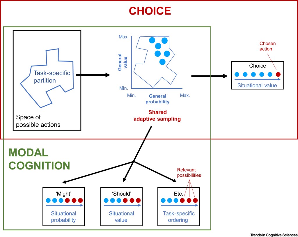 Schematic illustration of the proposed shared adaptive sampling hypothesis in choice contexts (red box) and its shared recruitment across diverse cognitive tasks involving modal thought (green box).