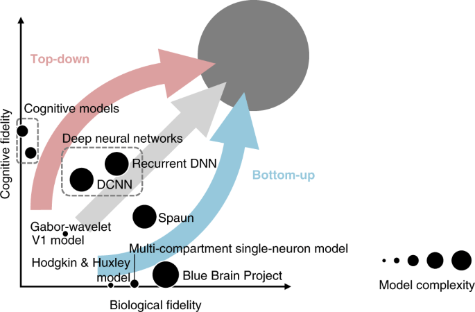 Models of the processes taking place in the brain can be defined at different levels of description and can vary in their parametric complexity (dot size) and in their biological (horizontal axis) and cognitive (vertical axis) fidelity.