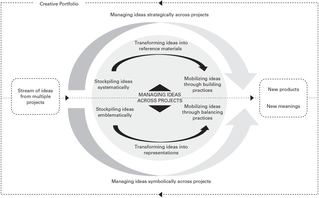 The emergent model presented shows how creators shift ideas across projects by stockpiling ideas from one creative project, transforming them into resources, and mobilizing them in their portfolios.