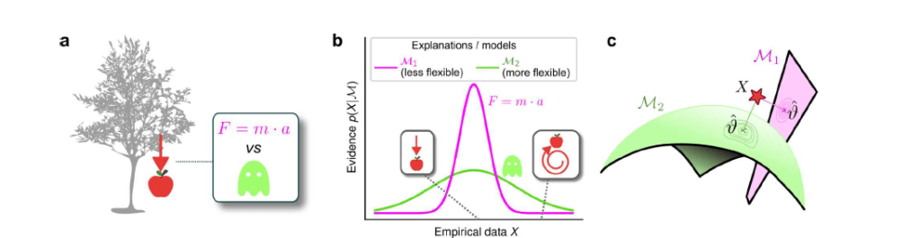 a: Occam’s razor prescribes an aversion to complex explanations (models). In Bayesian model selection, model complexity is a measure of the flexibility of a model, or its capacity to account for a broad range of empirical observations. In this example, we observe an apple falling from a tree (left) and compare two possible explanations: 1) classical mechanics, and 2) the intervention of a ghost.