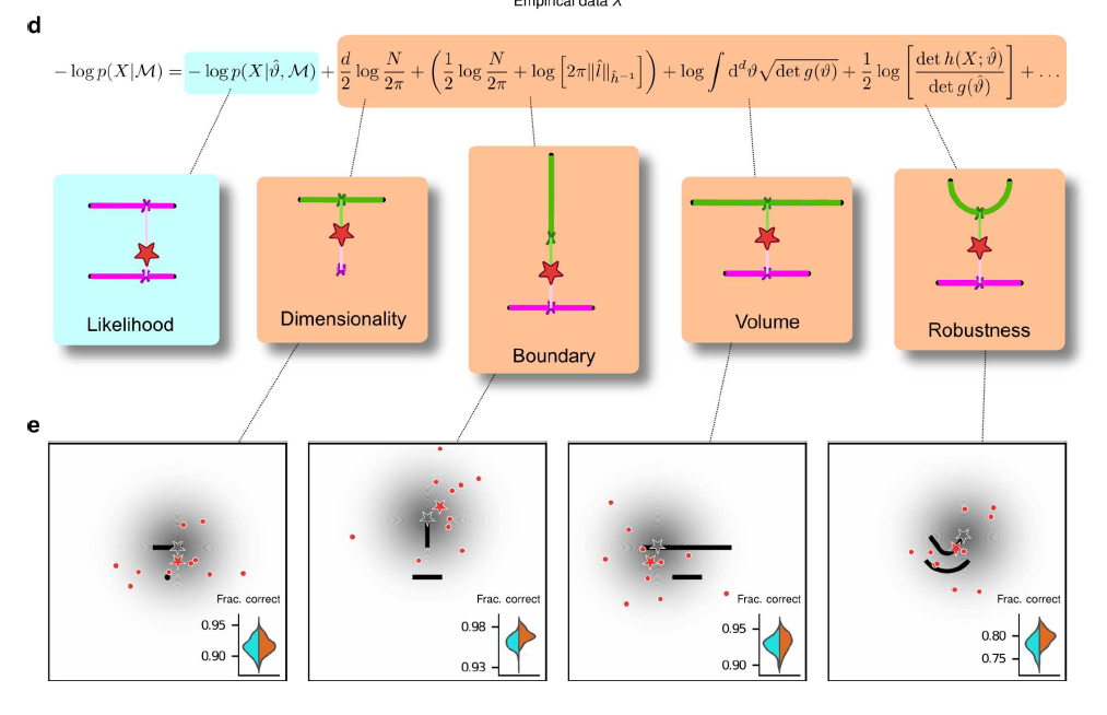 The first is theoretical: we derived a new term of the Fisher Information Approximation (FIA) in Bayesian model selection that accounts for the possibility that the best model is on the boundary of the model family. This boundary term is important because it can account for the possibility that, because of the noise in the data, the best value of one parameter (or of a combination of parameters) takes on an extreme value. This condition is related to the phenomenon of “parameter evaporation” that is common in real-world models for data. Moreover, boundaries for parameters are particularly important for studies of perceptual decision-making, in which sensory stimuli are limited by the physical constraints of the experimental setup and thus reasoning about unbounded parameters would be problematic for subjects. For example, imagine designing an experiment that requires subjects to report the location of a visual stimulus. In this case, an unbounded set of possible locations (e.g., along a line that stretches infinitely far in the distance to the left and to the right) is clearly untenable. Our “boundary” term formalizes the impact of considering the set of possibilities as having boundaries, which tend to increase local complexity because they tend to reduce the number of local hypotheses close to the data (see Figure b).