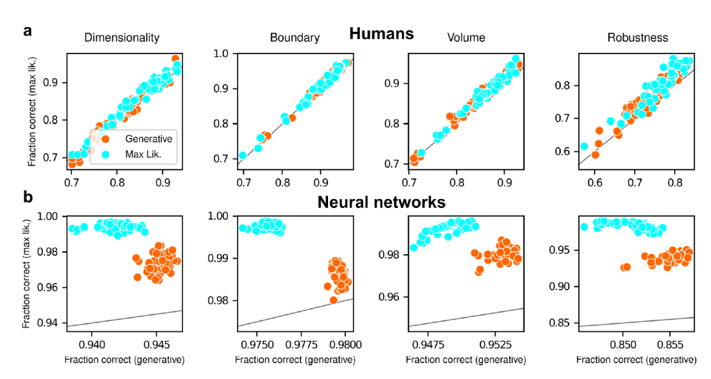 b: Data from individual ANNs (points), trained on the generative (orange) or maximum-likelihood (cyan) task. Network performance was always highest when evaluated against maximum-likelihood solutions, compared to generative solutions (all dots are above the identity line).
