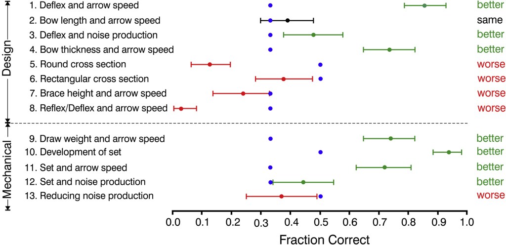 There were 13 questions about bow attributes. Hadza responses were compared to the “correct” responses as revealed by experimental and engineering research (blue dots)