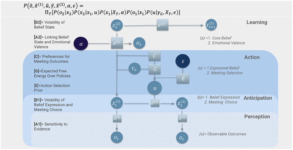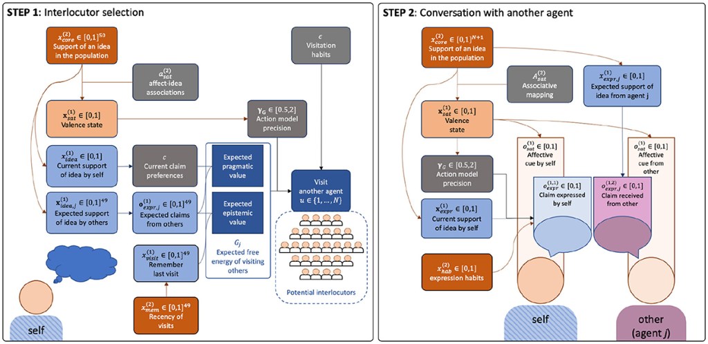 Each meeting consisted in exchanges of expressed support for an idea [in the range (0,1)] and affective cues [negative-positive, in the range (0,1)]. Expressed support was conditioned on: (1) Expression habits formed during past conversations, (2) one’s current support for the idea. Expressed affective cues were conditioned on one’s current valence state. Affect played a role during Steps 1 and 2: Relative reliance on habitual tendencies vs. deliberation (expected free energy G) was regulated via action model precision. The latter was conditioned on one’s current valence state, which was conditioned on one’s current support of an idea, depending on previously learned associations between expressed ideas and concurrent affective cues (from oneself and others).