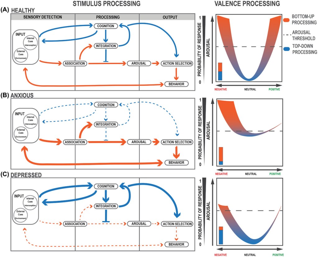 (A–C, left) Flow of stimulus and valence processing in (A, left) healthy, (B, left) anxious, and (C, left) depressed states. Larger, thicker arrows indicate increased bias or activation. Dashed, thinner arrows indicate decreased activation.