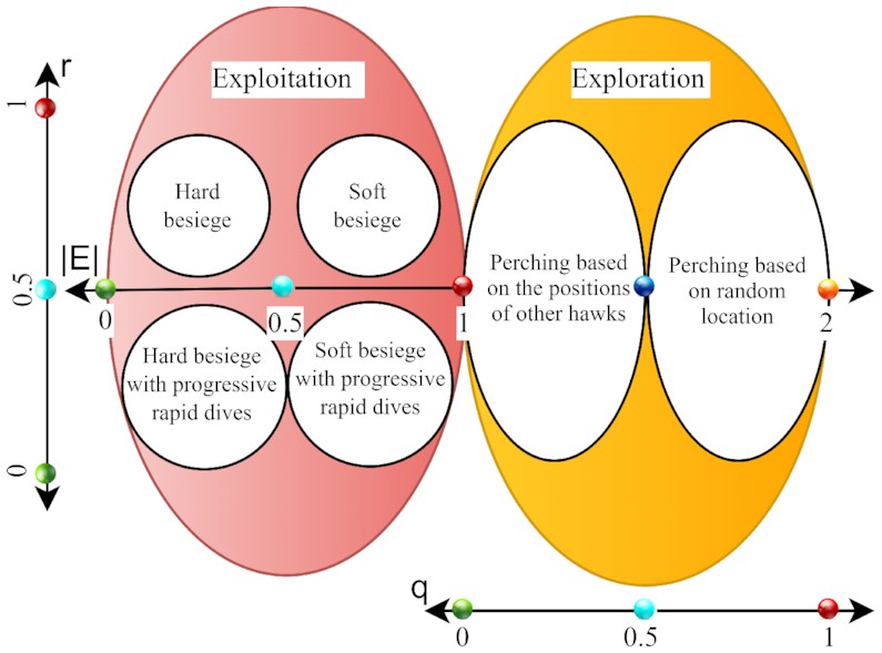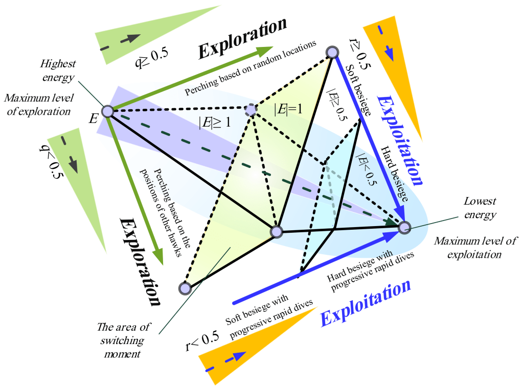 The Harris hawks optimization is a recently developed algorithm that simulates Harris hawks’ special hunting behavior known as “seven kills”. The HHO algorithm has some unique features compared with other popular swarm-based optimization methods.