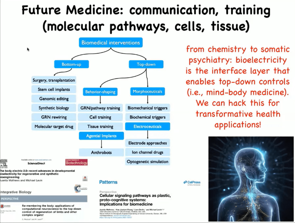 In Dr. Michael Levin’s lab, they borrow agential concepts from cognitive and behavioral science to describe biological phenomena such as development, regeneration, and cancer suppression. To advance these concepts, they create computer-designed synthetic living beings that exhibit novel behaviors yet no specific evolutionary history. This talk not only highlights recent successes but explores the implication of these findings for regenerative medicine, cognitive science, and human flourishing.