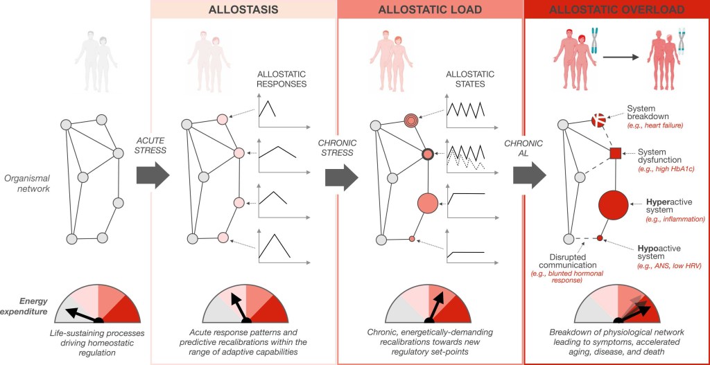 Therefore, we propose that the transition from adaptive allostasis to maladaptive allostatic states, allostatic load, and allostatic overload arises when the added energetic cost of stress competes with longevity-promoting growth, maintenance, and repair. Mechanistically, the energetic restriction of growth, maintenance and repair processes leads to the progressive wear-and-tear of molecular and organ systems. The proposed model makes testable predictions around the physiological, cellular, and sub-cellular energetic mechanisms that transduce chronic stress into disease risk and mortality. We also highlight new avenues to quantify allostatic load and its link to health across the lifespan, via the integration of systemic and cellular energy expenditure measurements together with classic allostatic load biomarkers.