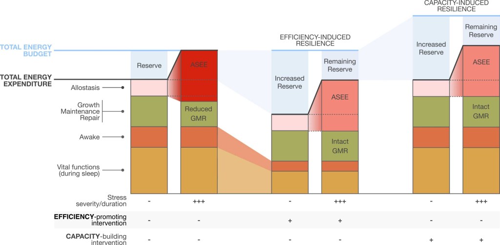Illustrated are two types of hypothetical scenarios for resilience-promoting interventions. Compared to the situation (left) where allostasis and stress-induced energy expenditure (ASEE) bankrupts the total energy budget and steals energy from growth, maintenance and repair (GMR), resilience to the same stressor can arise from either a reduction in basal metabolic costs (metabolic compensation, middle) or increase the total energy budget (right).