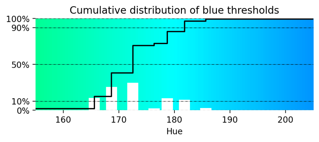 That means people, in this sample, are very “blue-inclusive”: cyan and turquoise are blue. By contrast, Patrick is blue exclusive (his boundary is 181, ~90% percentile), and cyan and turquoise feel green to him.