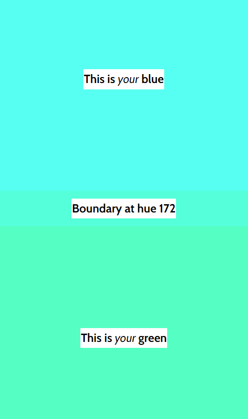 The median boundary between green and blue in this sample is around hue 172. The nominal boundary should be at 180, which corresponds to cyan (aka #00FFFF, or rgb(0, 255, 255)).
