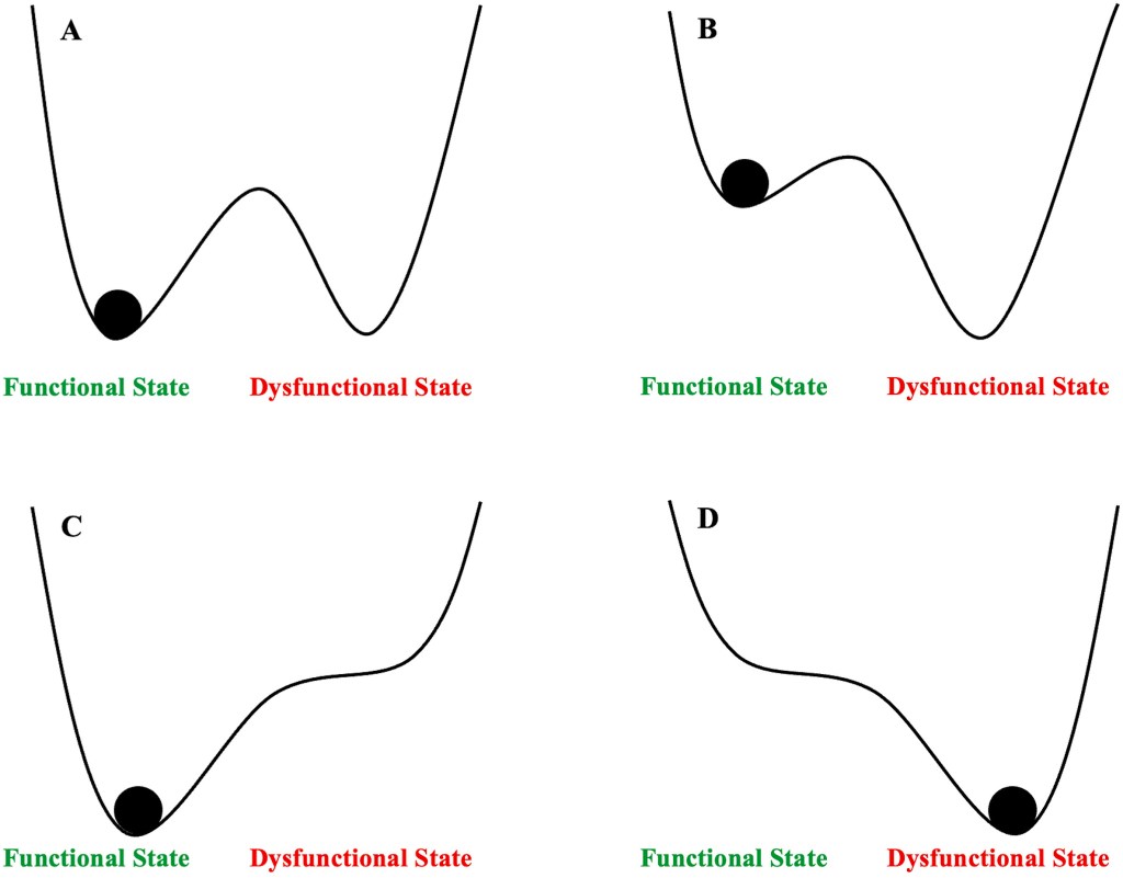 Fig. A displays a relatively strong attractor which is likely to demonstrate resilience following a perturbation. Note, however, that an equally strong dysfunctional state exists at the same time, although it is generally not accessible. If the perturbation is strong enough to move the ball to the dysfunctional state, the ball would stabilize in the dysfunctional state and an equally strong perturbation is needed to induce another shift.