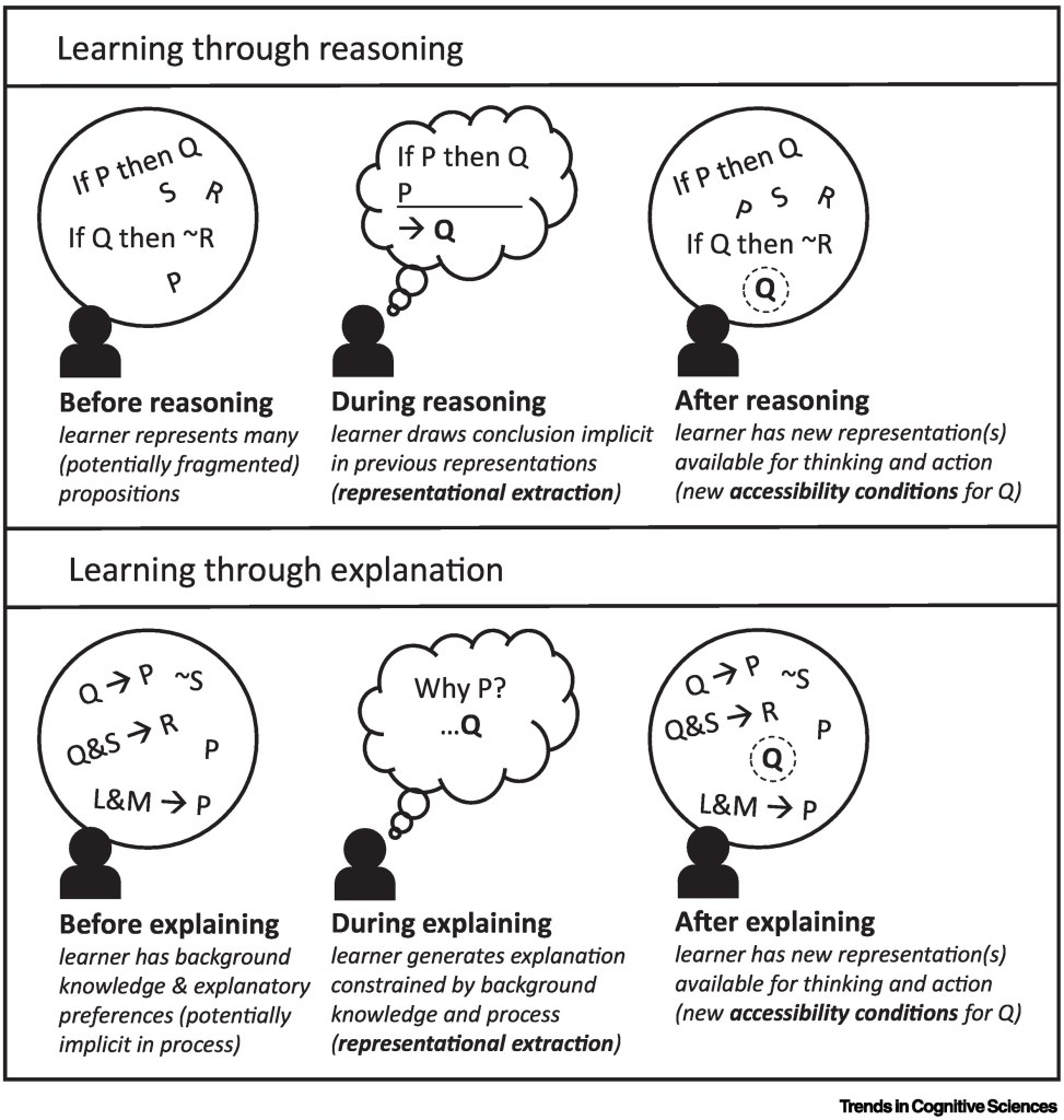 Two examples of LbT, schematically representing the role of representational extraction and its consequences for the accessibility conditions of representations. Note that LbT processes can change multiple representations; for example, explaining might not only result in the explicit representation of some explanation, Q, but also in the target of that explanation being represented at a different level of abstraction