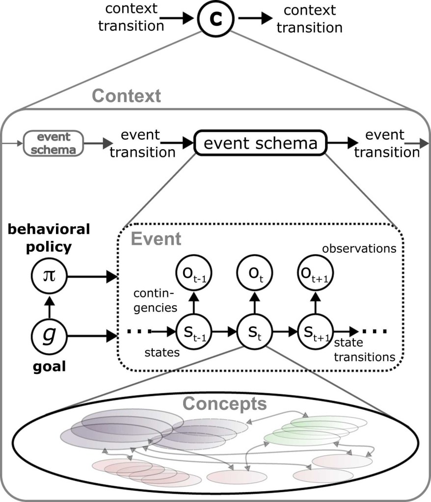Top: The inferred context c sets priors over events and concepts. Event progressions and potential context switches are co-inferred via an additional episodic memory loop, which supports selective, active inference-driven planning and reasoning on context-relative, event-schematic levels.
