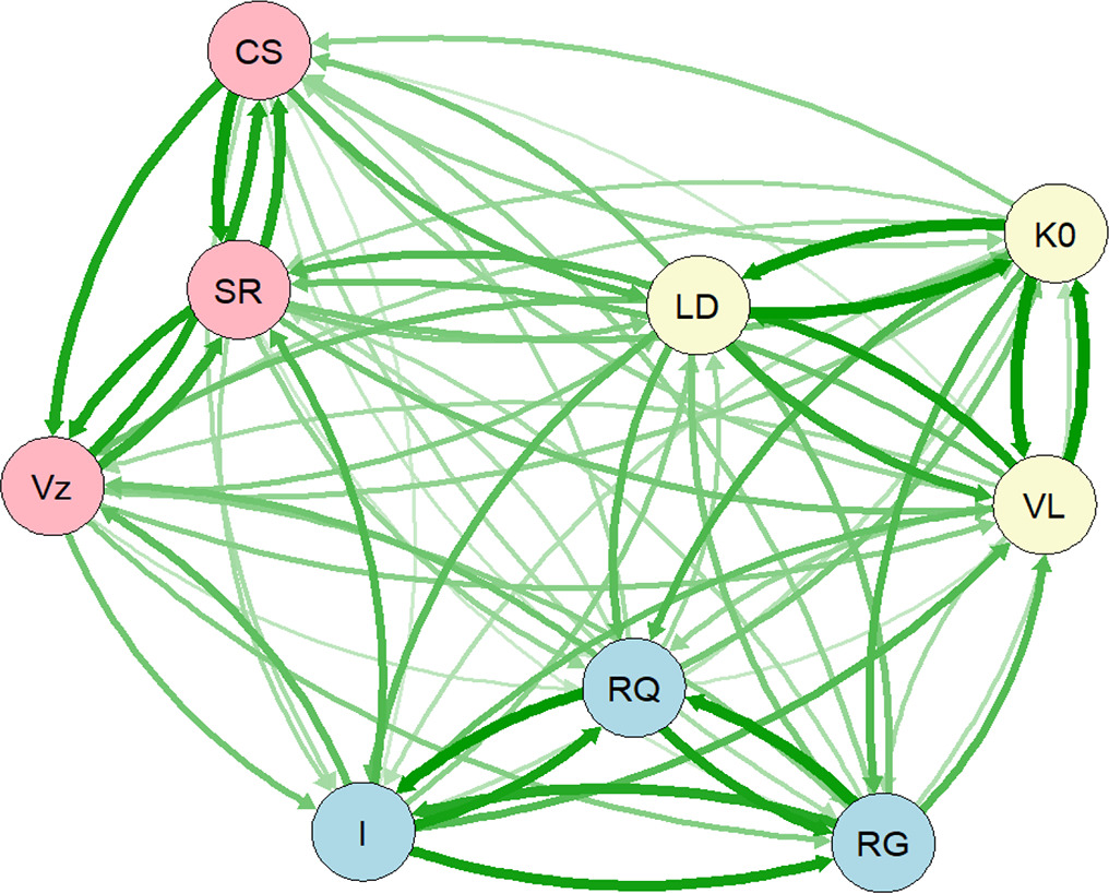 Note. CS = closure speed; SR = spatial relations; Vz = visualization; I = induction; RQ = quantitative reasoning; RG = general sequential reasoning; LD = language development; K0 = general (verbal) information; VL = lexical knowledge; mauve coloured circles represent fluid reasoning abilities (Gf);