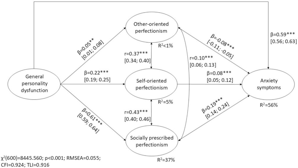These findings supported our hypothesis that two dimensions of perfectionism (SOP, SPP) may have mediating roles in the relationship between personality dysfunction and anxiety. This result is also in line with recent research reviewed, which suggests that the interpersonal components of perfectionism are associated with borderline pathology. However, we have also found a strong, direct positive relationship between general personality dysfunction and anxiety.
