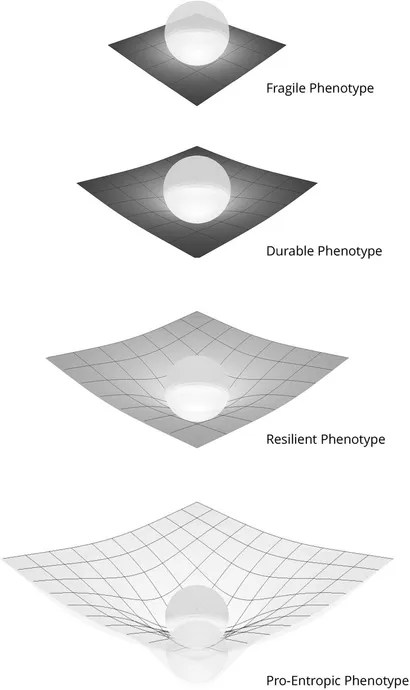 Spanning a range of adaptive resilience strategies, we propose four phenotypes—fragile, durable, resilient, and pro-entropic (PE)—each characterized by a constellation of genetic, epigenetic, developmental, experiential, and environmental factors.