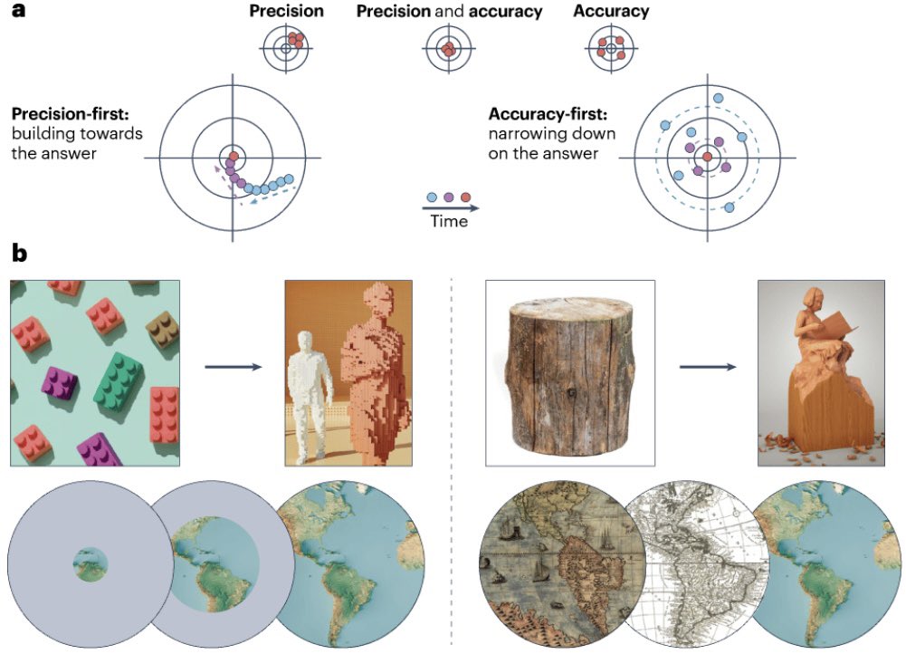 a, Precision and accuracy (or bias and variance) from statistics. Precision means that hits are closely clustered. Accuracy means that hits are centred around the true target. For bottom-up neuroscience, ‘hits’ will be close to each other at every step of the way (high precision), but the starting point may be far from the ultimate target (low initial accuracy). Top-down neuroscience goes for the desired target right away, but its tools may initially be inadequate, resulting in wide dispersion (low precision) but more focus around the target itself (higher accuracy).
