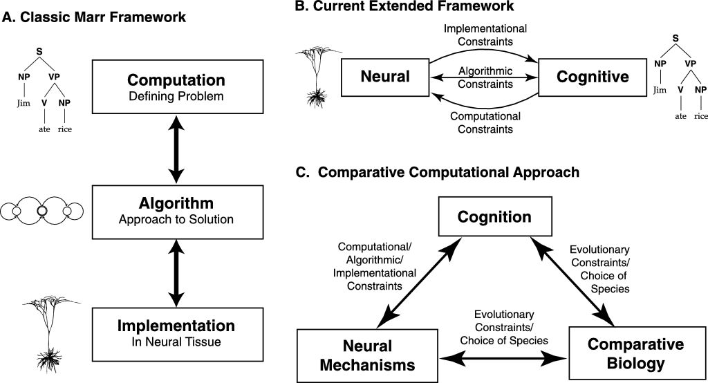 The general structure of the computational framework I advocate here is shown in Fig. 1C, which illustrates the need for productive interdisciplinary bridges between three disciplines, to form the vertices of a “computational triangulation” approach. The first two vertices are no surprise: the neurosciences and the cognitive sciences. Building bridges between these two domains is the traditional “grand challenge” of cognitive science of Fig. 1B, to bridge the apparent gap between brain and mind. However, the third, comparative, vertex traditionally plays a minor role in cognitive science. But to fully leverage the importance of algorithmic and implementational insights in constraining cognitive theories, species differences in cognition need to be identified and understood.