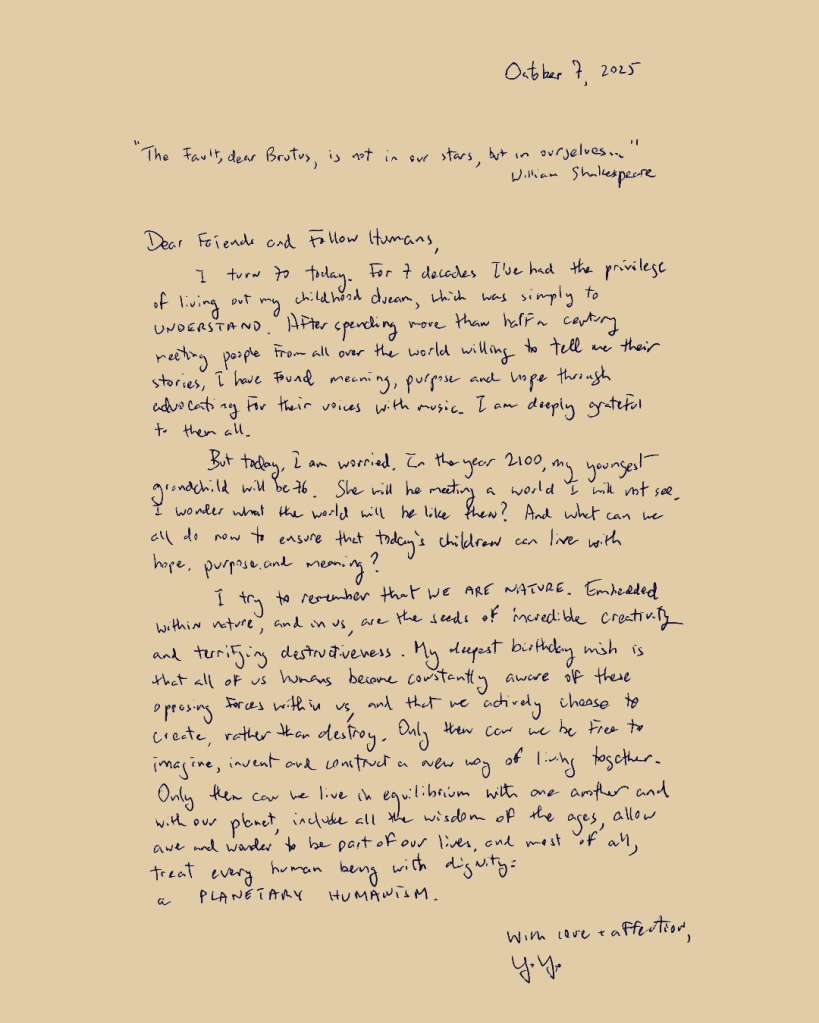 I turn 70 today. For 7 decades I’ve had the privilege of living out my childhood dream, which was simply to UNDERSTAND. After spending more than half a century meeting people from all over the world willing to tell me their stories, I have found meaning, purpose and hope through advocating for their voices with music. I am deeply grateful to them all.