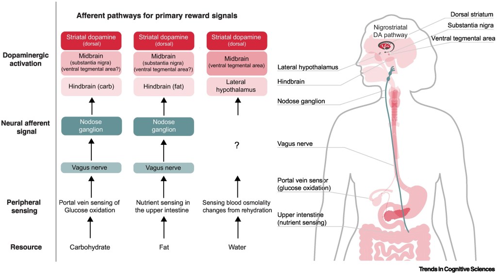 Carbohydrates (sugar): Although the exact afferent pathway for carbohydrates is still the subject of investigation, there is evidence that glucose oxidation after sugar consumption is sensed in the portal vein and transmitted through the vagus nerve and the nodose ganglion to the midbrain dopamine system.