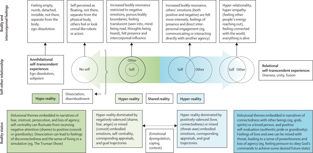In our study, some participants described dynamic, sometimes rapid, shifts between different emotions and world experiences, moving back and forth across the spectrum. These fluctuations were characterised by varying degrees of emotional instability shaped by factors such as coping strategies (eg, avoidance vs immersion or absorption), substance use, not getting enough sleep, and the affective character of the social and material environment. Because feelings of threat could be had both in relation to shame and awe (as in threat-awe), persecutory ideas were present at either side, but the representation of the self was negative on the left (eg, perceive themselves to be a “paedophile”, “monster”, or “bad person”) and positive on the right (eg, a spiritual person, the “chosen one”, or connected to God.). At the extreme ends are high-intensity self-transcendent experiences, which were described as positive (eg, similarly to peak and mystical experiences) when immersed in positive emotions, or negative when resulting from disembodiment in the context of predominantly negative embodied emotions (such as shame, fear, anger, and hubristic pride).