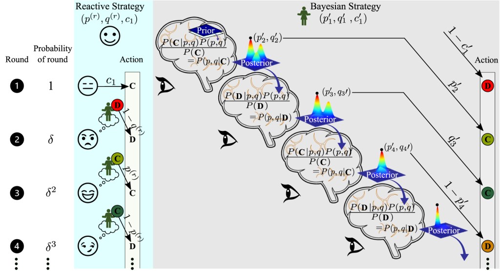 Our analysis reveals how learning the opponent’s strategy through Bayesian inference, as opposed to utility maximization, can be beneficial in the long run, in preventing exploitation and eventual invasion by reactive strategies.
