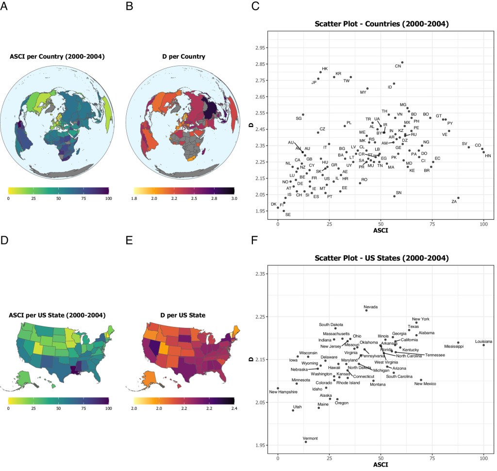 Except for panels (A) and (D), we excluded countries/states with fewer than 100 participants to avoid potentially misrepresenting a country/state based on very few participants only. The theoretical range of the ASCI is 0 to 100, and the theoretical range of D is 1 to 5. The means of the ASCI were 38.26 (SD = 23.24) for the worldwide and 46.26 (SD = 17.09) for the US analyses, and the means of D were 2.52 (SD = 0.74) for the worldwide and 2.17 (SD = 0.74) for the US analyses.