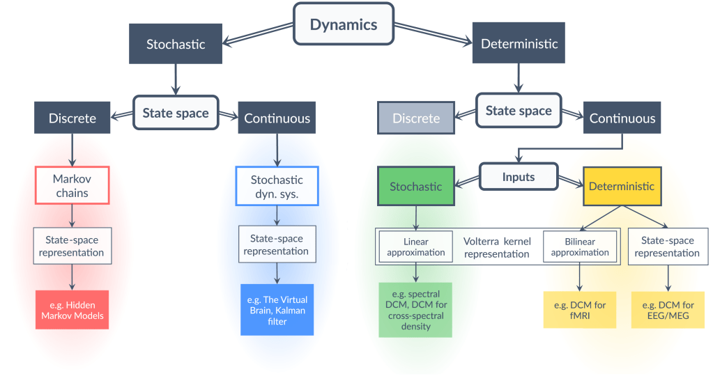 The key factors guiding the selection of a particular framework are the nature of dynamics (discrete or continuous) and the nature of state space (stochastic or deterministic). In addition, the nature of the inputs (stochastic or deterministic) has relevance for continuous deterministic systems. In the particular case of continuous deterministic systems with stochastic inputs, one can use a linear response function, which is the first-order term of the Volterra kernel representation of the system, to directly approximate the outputs from the inputs without reference to the states. Effectively, this implies that the dynamics do not need to be integrated over time, which greatly simplifies model inversion. In all other cases, model inversion entails tracking the states or their distribution through time.