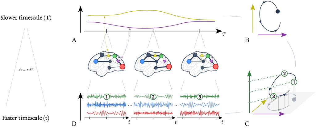 In summary, the brain is understood to navigate slowly (A) through a repertoire of fast stable dynamics (D). Crucially, the slow variables are directly linked to the dynamics of the fast variables (C). Similarly, changes in the fast variables’ dynamics can be attributed to changes in the slow variables. Therefore, modelling the complex dynamics of multiscale dynamical systems can be simplified by focusing on the dynamics of the slow variables and the mapping from slow to fast variables.