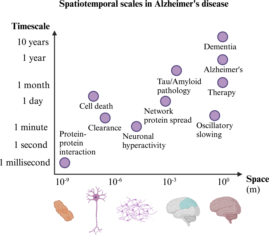 Complex biological processes, such as the development of neurodegenerative diseases such as AD, evolve over a range of interacting spatio-temporal scales. Focusing on AD, protein misfolding ultimately leads to the spread of toxic tau and amyloid-β proteins through axonal fibres, which is partially cleared through cell regulation. Ultimately, this leads to cell death and pathological neural dynamics. This manifests in tau and amyloid pathology and, finally, cognitive decline which can be combatted with therapy. The MM of this process must take into account the full range of spatio-temporal scales to build a mechanistic understanding of AD.