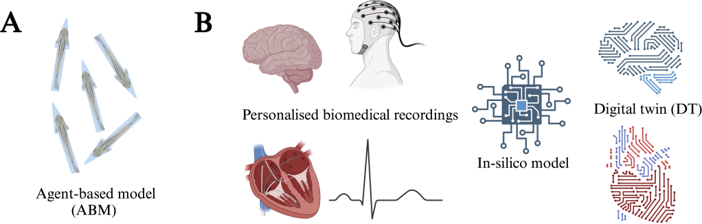 (B) DT (digital twins) are simulation-based models of physical systems implemented in a computer. One application of biomedicine is to use personalized recordings of neural activity or heartbeat data to calibrate individual in silico models. Ultimately, this will lead to a virtual version of the biological system where interventions can be tested via simulation.
