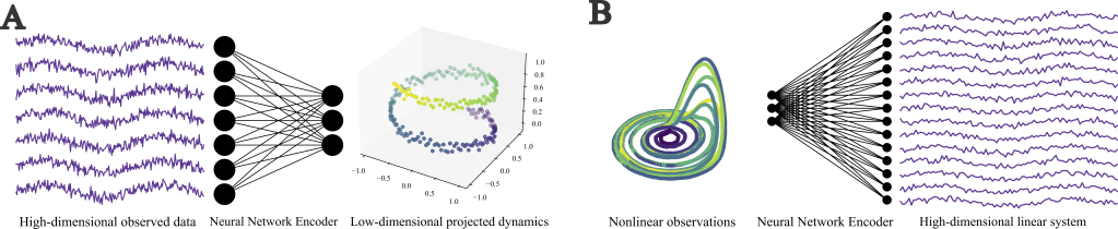 (B) Following the theory of the Koopman operator, nonlinear dynamics can be ‘lifted’ into high-dimensional spaces where the dynamics are approximately linear. This projection can be achieved with deep learning techniques such as neural networks.