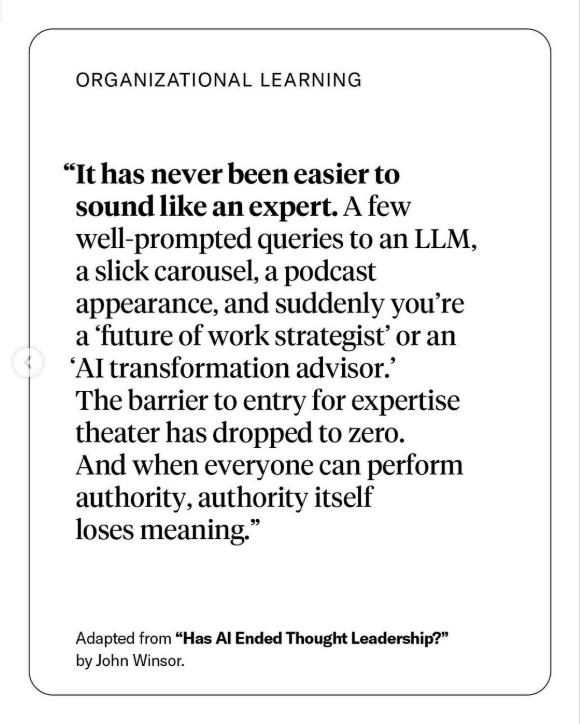 As generative AI and content platforms make it effortless to sound authoritative, organizations are being overwhelmed by polished insight that rarely translates into real change.